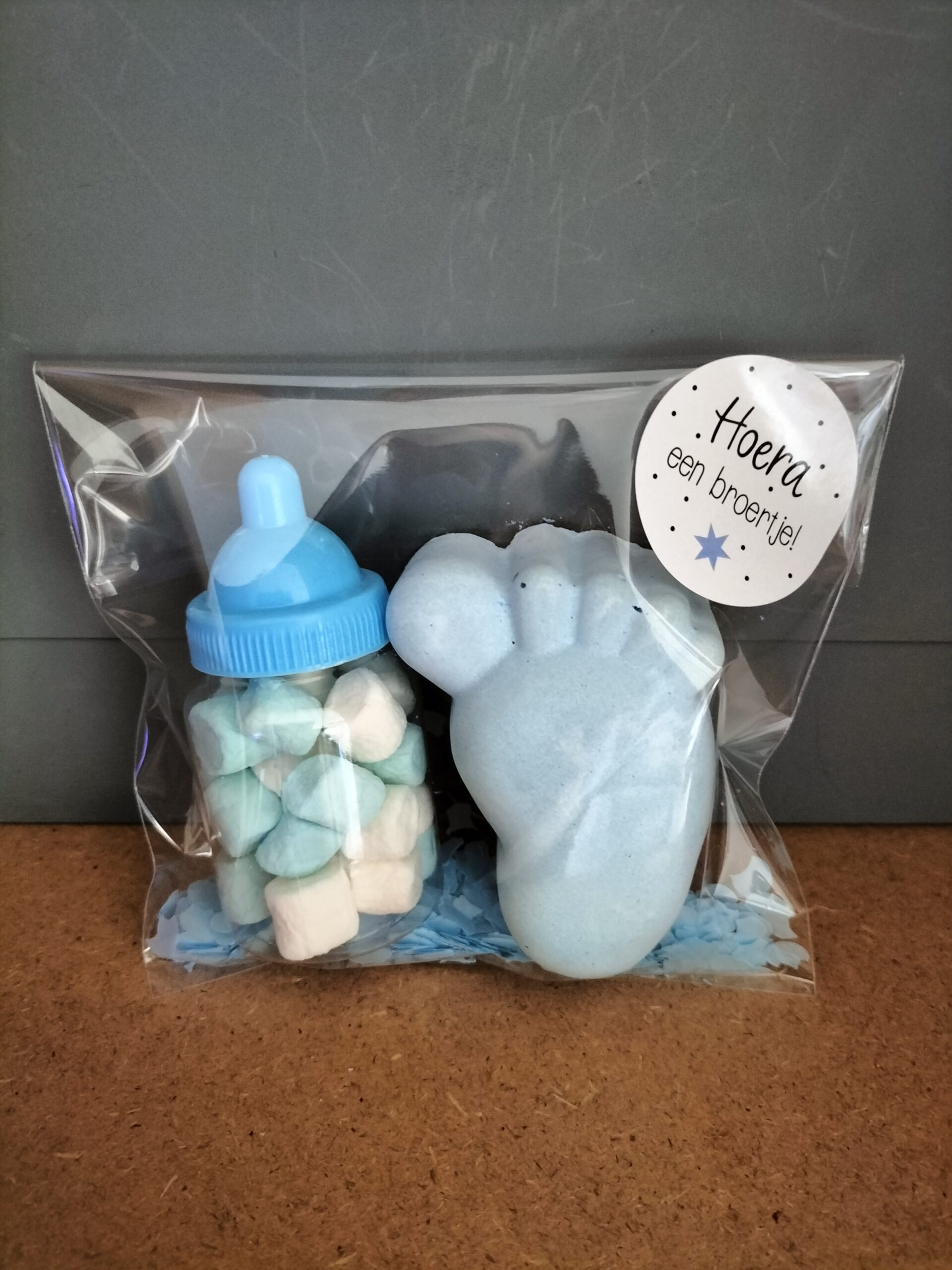 Geboorte traktatie met flesje blauw